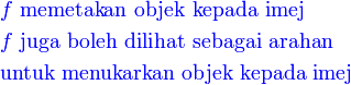 Selain dari sebagai arahan, fungsi juga boleh dilihat sebagai suatu hubungan, dan kita katakan objek dipetakan kepada imej
