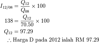 ▶Jika harga D pada 2008 ialah RM 70.50. Kira harga D pada 2012