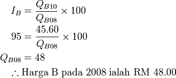 b) Harga barang B pada 2010 ialah RM 45.60. Apakah harga barang B pada 2008?
