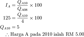 a) Harga barang A pada 2008 ialah RM 4.00. Apakah harga barang A pada 2010?Indeks harga bagi A bagi tahun 2010 berasaskan 2008 ialah 125