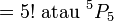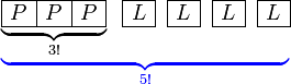 Agak merumitkan untuk senaraikan semuanyaSebaliknya kita telah kumpul semua perempuan dan kumpulan ini boleh dianggap satu "objek"4 lelaki lain boleh disusun mana-mana dengan kumpulan tadi, bermaksud kita ada4 lelaki lain boleh disusun mana-mana dengan kumpulan tadi, bermaksud kita ada berapa "objek" berlainan untuk disusun?Kita lukis dulu 4 lelakiKita lukis dulu 4 lelaki berasingan.Kita lukis dulu 4 lelaki berasingan. Perhatikan kita di sini bukan melukis kedudukan seperti sebelum ini tapi untuk membantu menentukan bilangan "objek"Jadi adaJadi ada 5 "objek" yang perlu disusunJadi