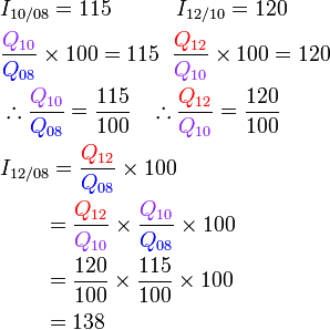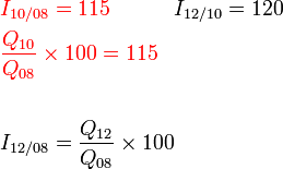 Indeks harga bagi A bagi tahun 2010 berasaskan 2008 ialah 125. Indeks harga bagi B bagi tahun 2010 berasaskan 2008 ialah 95.