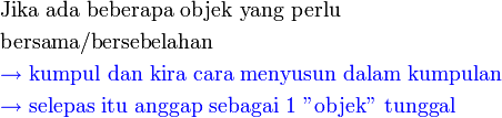 Agak merumitkan untuk senaraikan semuanyaSebaliknya kita telah kumpul semua perempuan dan kumpulan ini boleh dianggap satu "objek"4 lelaki lain boleh disusun mana-mana dengan kumpulan tadi, bermaksud kita ada4 lelaki lain boleh disusun mana-mana dengan kumpulan tadi, bermaksud kita ada berapa "objek" berlainan untuk disusun?Kita lukis dulu 4 lelakiKita lukis dulu 4 lelaki berasingan.Kita lukis dulu 4 lelaki berasingan. Perhatikan kita di sini bukan melukis kedudukan seperti sebelum ini tapi untuk membantu menentukan bilangan "objek"Jadi adaJadi ada 5 "objek" yang perlu disusunJadi
